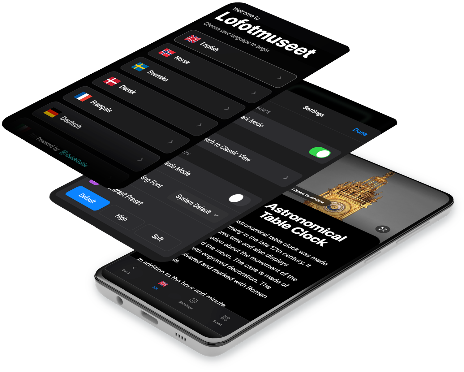 Automatisk genererte lydguider av tekstene til opptil 9+ språk for en personlig opplevelse etter inngang.